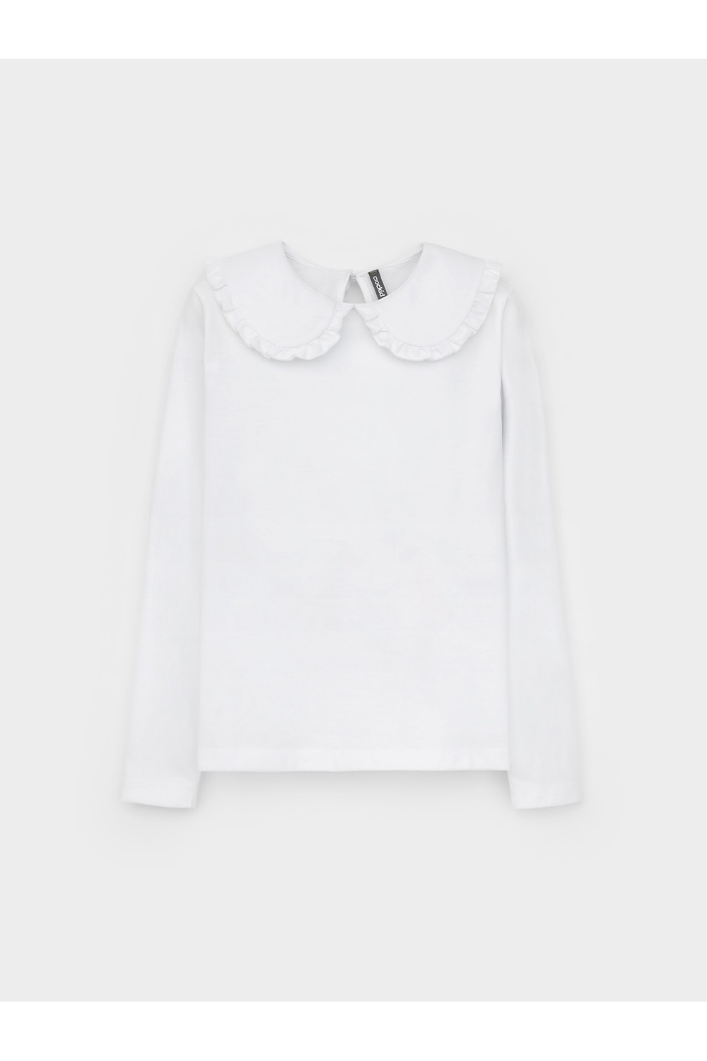 Блузка школьная для девочки с отложным воротником из трикотажа супрем. Застёгивается на пуговицу и петельку из шляпной резины. Воротник украшен оборкой. Рукава и низ изделия обработаны плоскими швами.