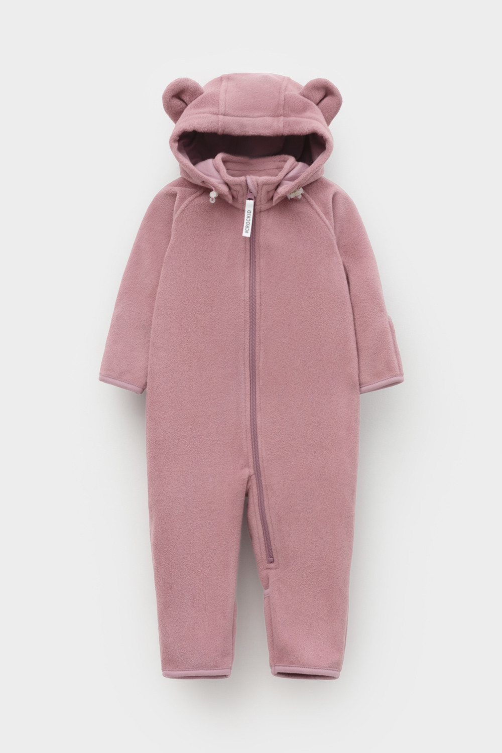 Флисовый комбинезон со съёмным капюшоном для девочки. У изделия высокий воротник и съёмный капюшон с декоративными ушками на кнопках. Застёгивается на удлинённую молнию. Предусмотрена защита шеи и подбородка. В размерах 40/62 - 48/74 на рукавах и штанинах есть удобные отвороты. Комбинезон сохраняет цвет и форму после многократных стирок.