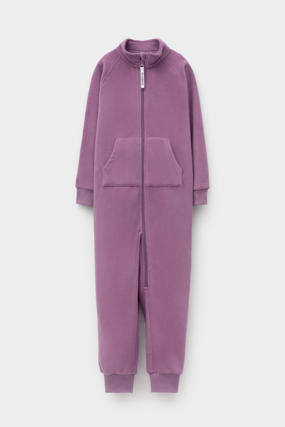 Флисовый комбинезон для девочки. У изделия высокий воротник и рукава-реглан. Застёгивается на удлинённую молнию. Предусмотрена защита шеи и подбородка. Спереди карман-кенгуру. Комбинезон сохраняет цвет и форму после многократных стирок.