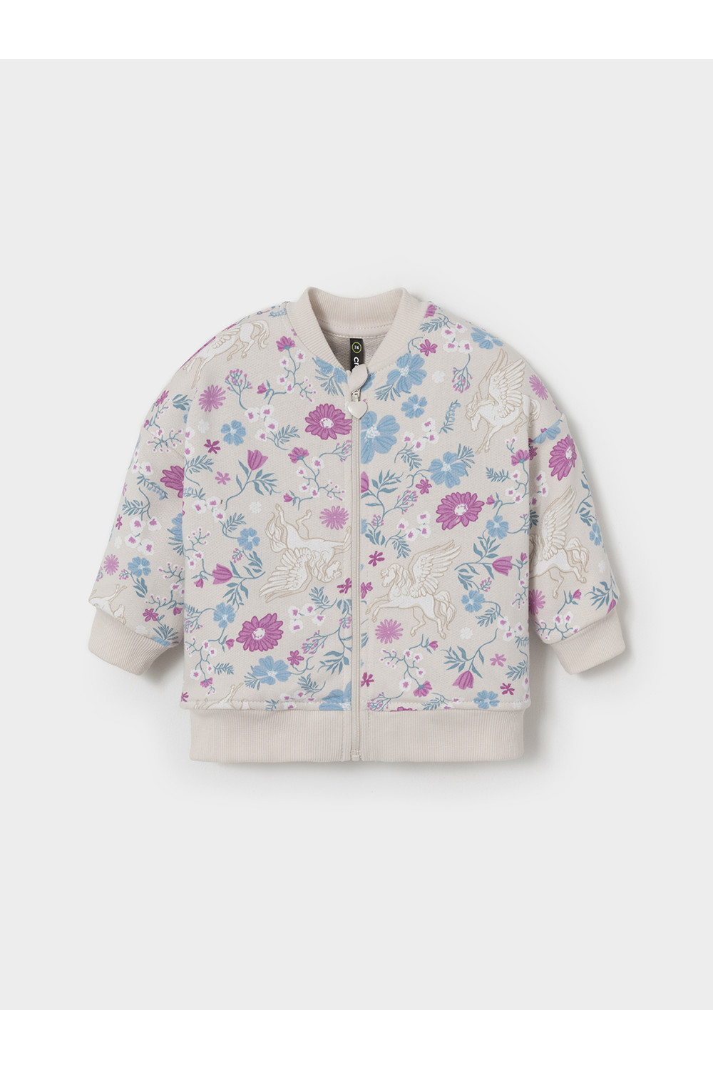 Трикотажная куртка-бомбер для девочки. Изготовлена из мягкого футера петли трёхнитки. Застёгивается на молнию с мягкой защитой шеи и подбородка. По бокам два кармана. Воротничок, манжеты и пояс выполнены из эластичного трикотажа в рубчик. Изделие сохраняет цвет и форму после многократных стирок. Все трикотажные полотна производятся в соответствии с нормами швейцарского сертификата ЭкоТекс.