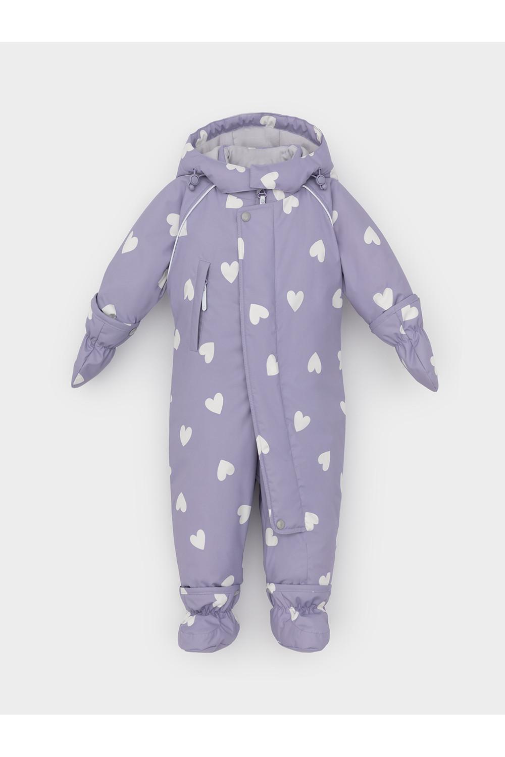 Зимний комбинезон ясельный с утеплителем Fellex®: 250 г/м2. Выполнен из мембранной ткани с дополнительной тефлоновой обработкой, которая предохраняет изделие от загрязнений и отталкивает влагу. Подклад выполнен из 100% хлопка. Комбинезон застёгивается на молнию и внешнюю планку на липучках, предусмотрена защита подбородка. Несъёмный капюшон имеет эластичную утяжку со стопперами. Резинка по спинке для лучшего прилегания. На груди карман на молнии. По рукавам и низу изделия эластичные манжеты, на ножках отстёгивающиеся силиконовые штрипки. До размера 80-86 включительно в комплекте идут рукавицы и пинетки. Во всех изделиях верхнего ассортимента для безопасности ребёнка предусмотрены светоотражающие элементы.
