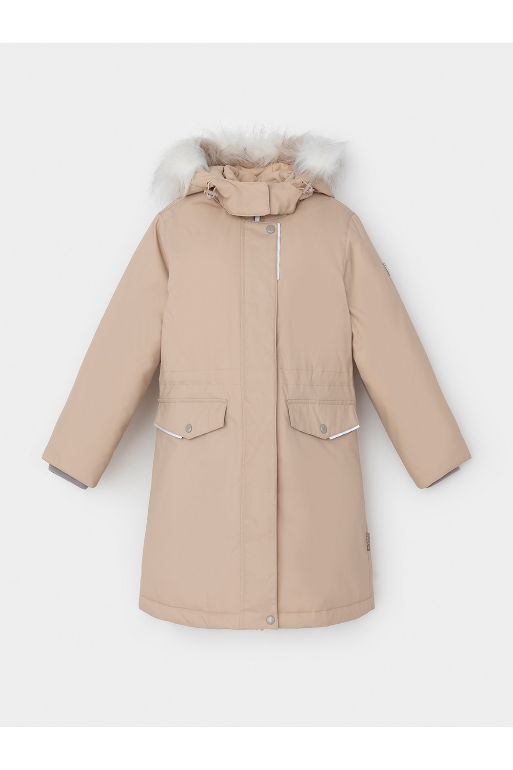 Зимнее пальто для девочки с утеплителем SEE®: 250 г/м2. Выполнено из мембранной ткани с дополнительной тефлоновой обработкой, которая предохраняет изделие от загрязнений и отталкивает влагу. Подклад выполнен из 100% полиэстера Tricot. Пальто застёгивается на молнию, предусмотрена защита подбородка. Съёмный капюшон на кнопках и липучках имеет отстёгивающийся искусственный мех. На рукавах мягкие манжеты. По бокам два кармана с клапанами, внутри карман на молнии. По талии эластичная утяжка со стопперами для регулировки ширины пальто. Во всех изделиях верхнего ассортимента для безопасности ребёнка предусмотрены светоотражающие элементы.