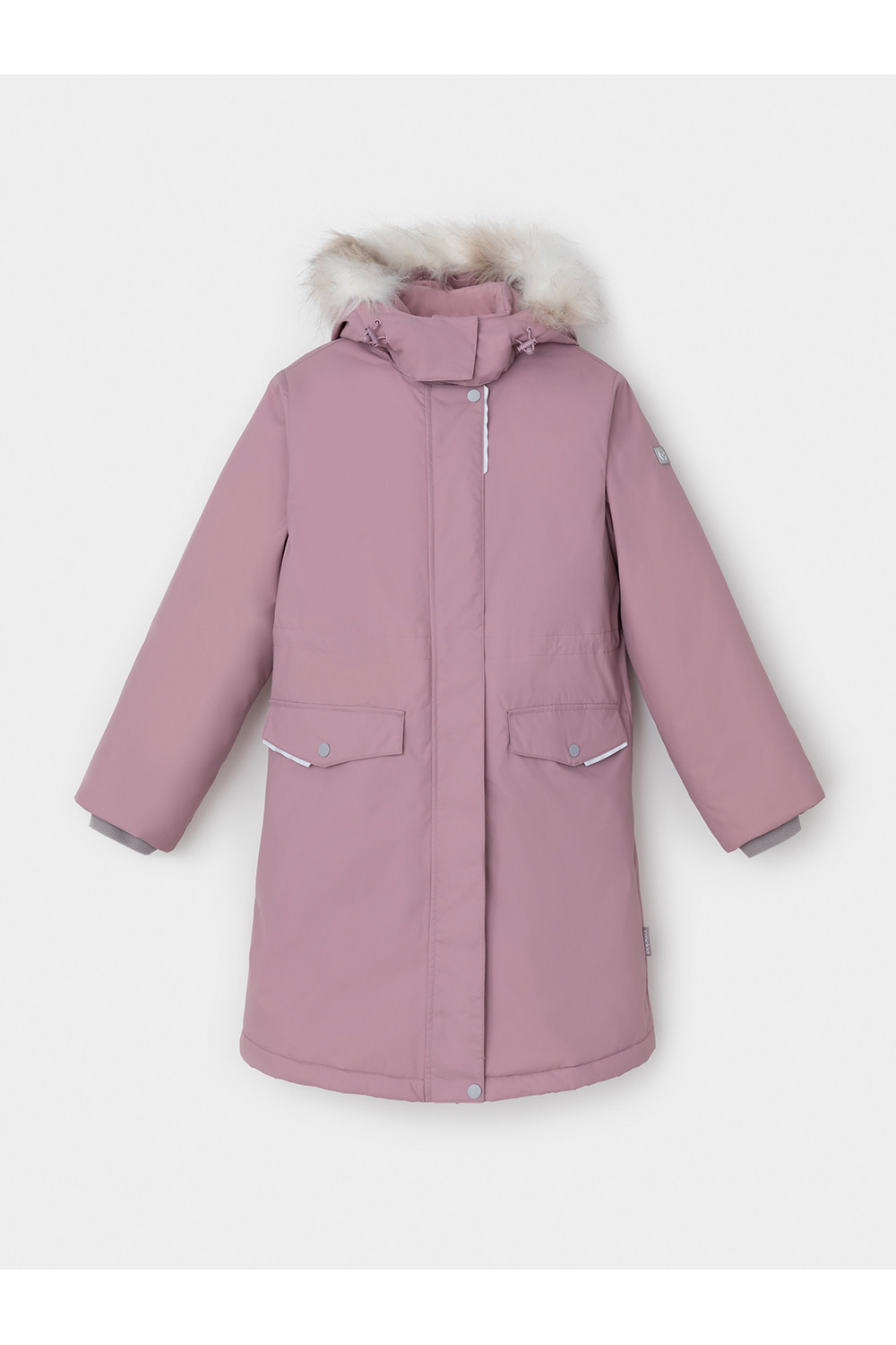 Зимнее пальто для девочки с утеплителем SEE®: 250 г/м2. Выполнено из мембранной ткани с дополнительной тефлоновой обработкой, которая предохраняет изделие от загрязнений и отталкивает влагу. Подклад выполнен из 100% полиэстера Tricot. Пальто застёгивается на молнию, предусмотрена защита подбородка. Съёмный капюшон на кнопках и липучках имеет отстёгивающийся искусственный мех. На рукавах мягкие манжеты. По бокам два кармана с клапанами, внутри карман на молнии. По талии эластичная утяжка со стопперами для регулировки ширины пальто. Во всех изделиях верхнего ассортимента для безопасности ребёнка предусмотрены светоотражающие элементы.