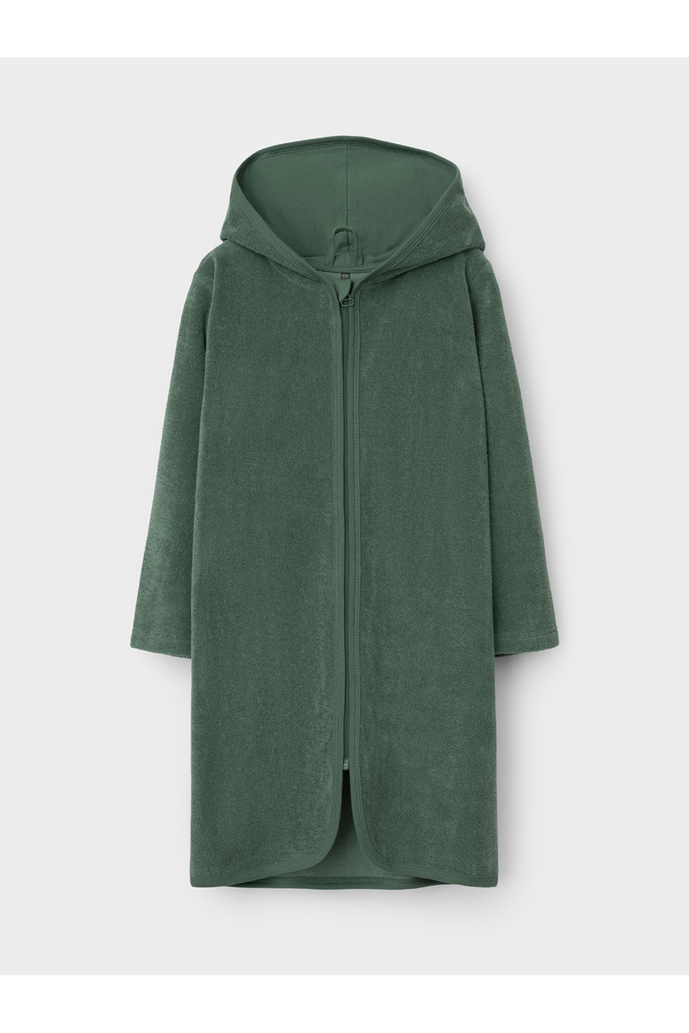 Однотонный махровый халат для мальчика на молнии без начёса. Капюшон с мягким подкладом. В боковых швах удобные карманы. Рукава и края изделия обработаны кантом.