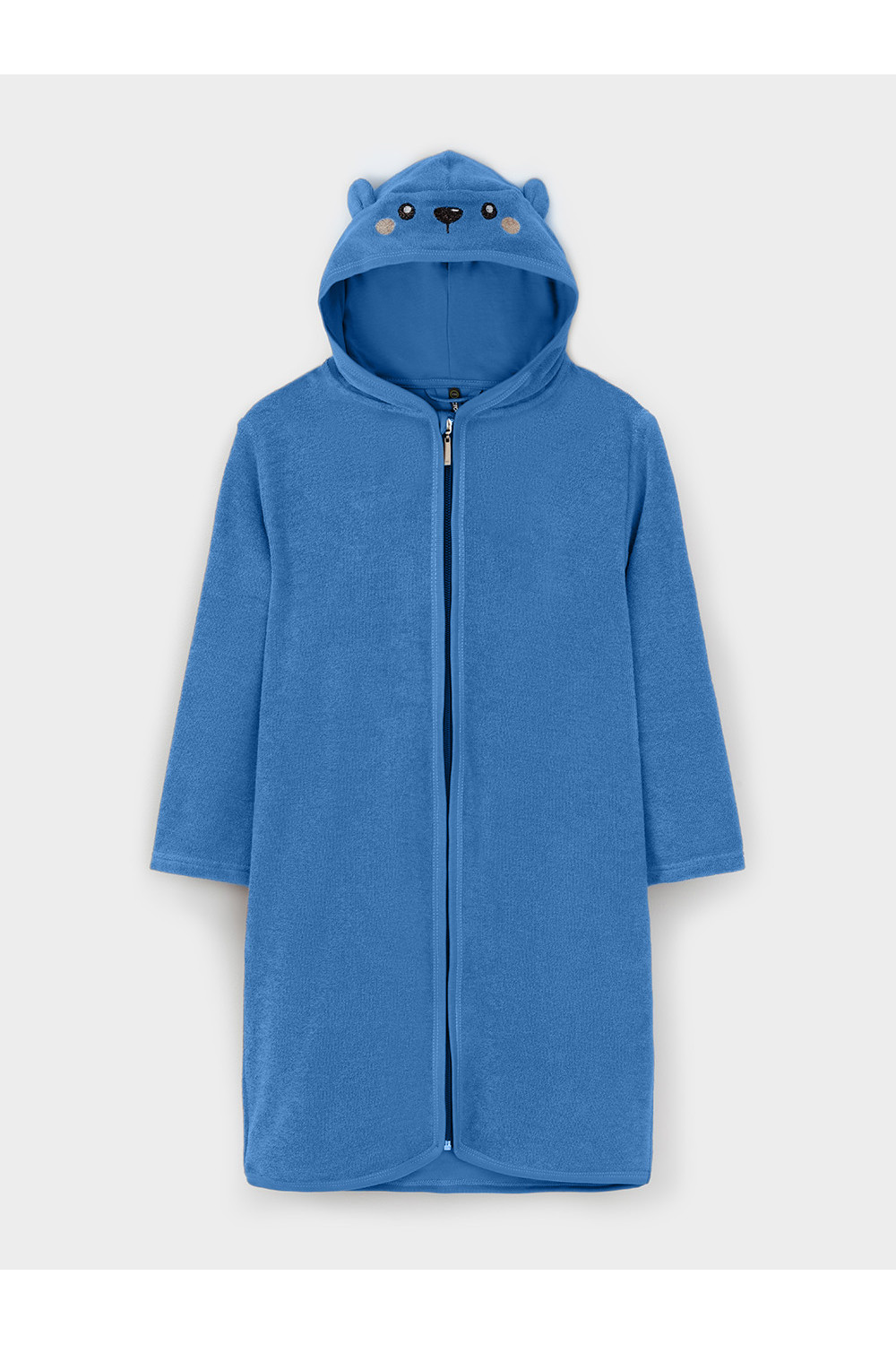 Халат на молнии с капюшоном. Изготовлен из мягкого махрового полотна, произведённого из натурального хлопка. В капюшоне подклад из высококачественного гладкого трикотажа супрем. Изделие украшено вышивкой и декоративными ушками. Края обработаны эластичным кантом. Все трикотажные полотна производятся в соответствии с нормами швейцарского сертификата ЭкоТекс.