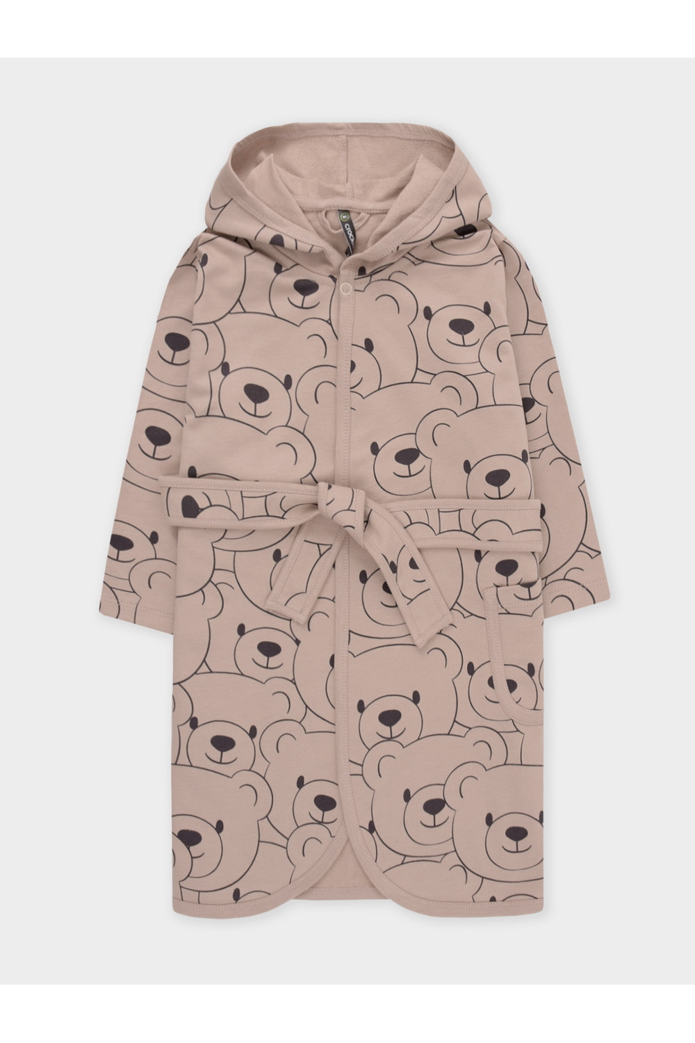 Халат с тонким капюшоном. Изготовлен из набивного хлопкового трикотажа футер петля. С помощью пояса можно регулировать посадку по фигуре. Сверху застёжка на кнопку. Края изделия обработаны мягким кантом. На боку накладной карман, уходящий в шов. Оригинальная набивка выполнена из стойких гипоаллергенных текстильных красителей. Все трикотажные полотна производятся в соответствии с нормами швейцарского сертификата ЭкоТекс.