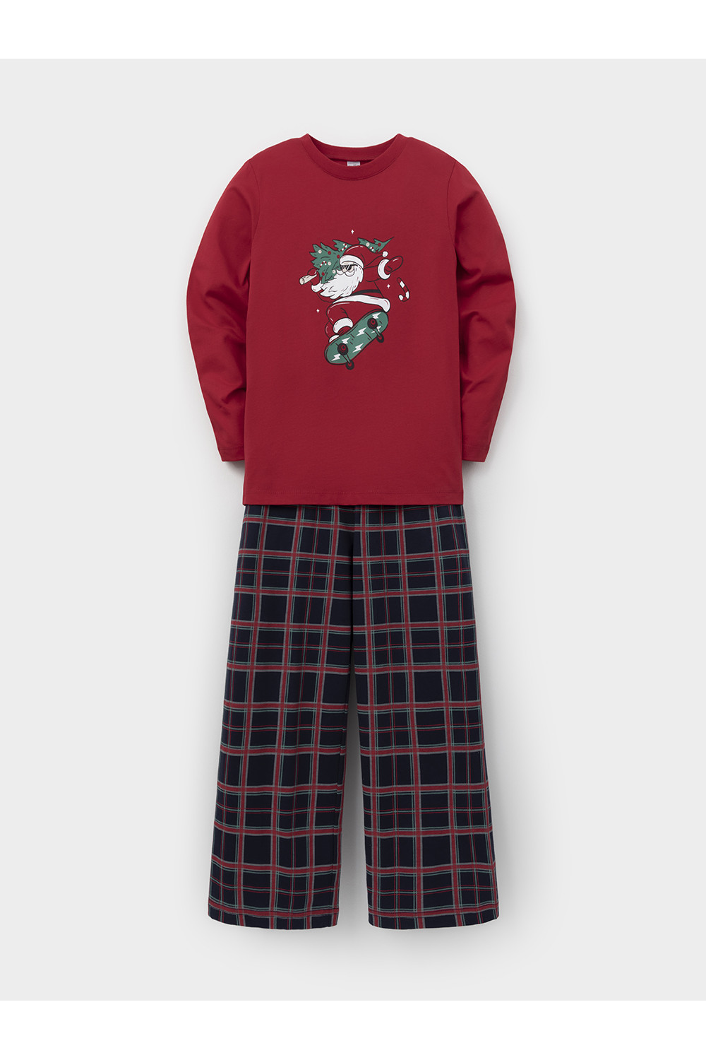 Новогодняя пижама из натурального хлопка для мальчика. Джемпер с длинными втачными рукавами и прямые брюки с эластичной резинкой в поясе. Пижама отлично подойдёт для создания уютных домашних образов или в качестве подарка на Новый год и Рождество. Оригинальная набивка и принт выполнены из стойких текстильных гипоаллергенных красителей. Изделие сохраняет цвет и форму после многократных стирок. Все трикотажные полотна производятся в соответствии с нормами швейцарского сертификата ЭкоТекс.