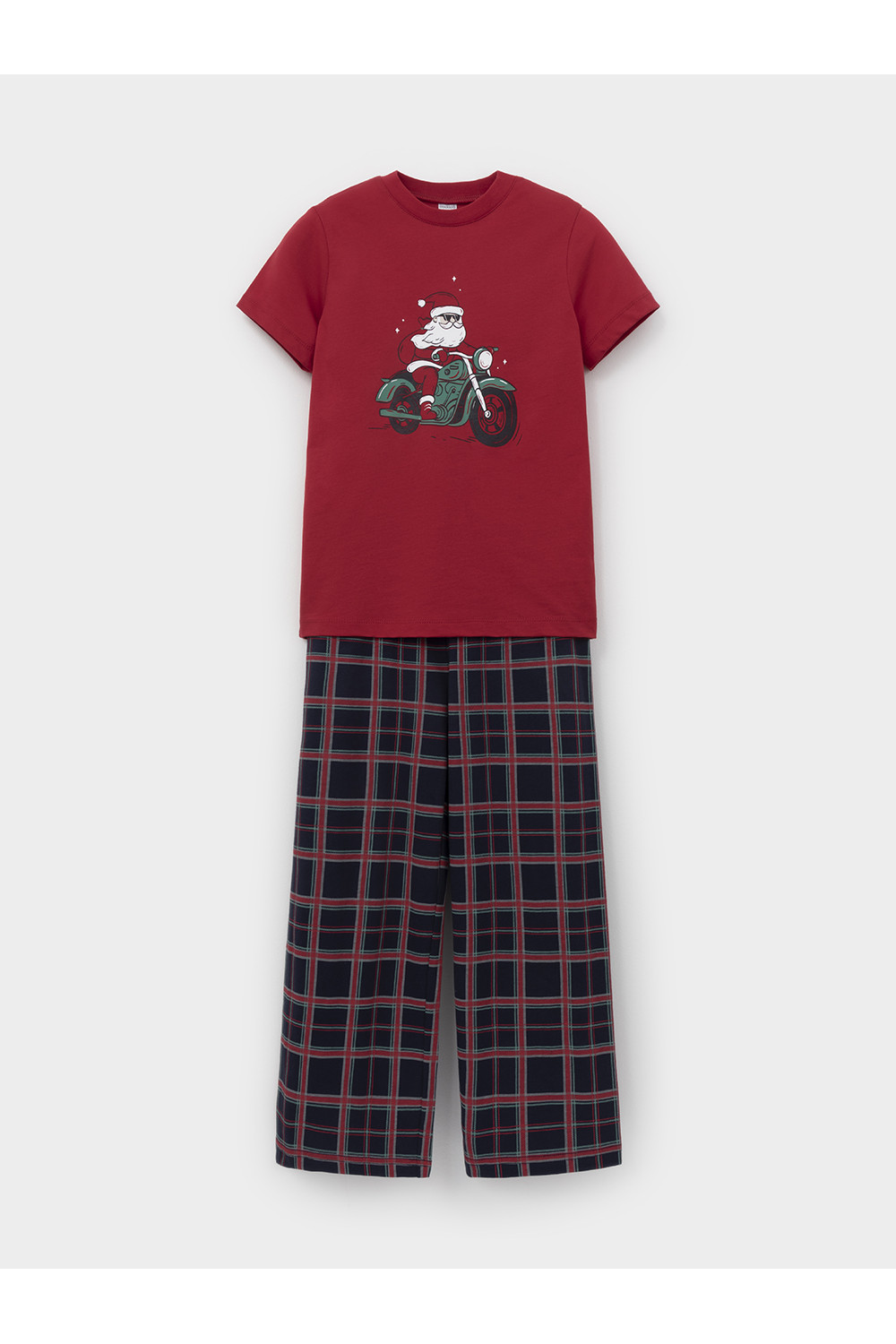 Новогодняя пижама из натурального хлопка для мальчика. Футболка с короткими втачными рукавами и прямые брюки с эластичной резинкой в поясе. Пижама отлично подойдёт для создания уютных домашних образов или в качестве подарка на Новый год и Рождество. Оригинальная набивка и принт выполнены из стойких текстильных гипоаллергенных красителей. Изделие сохраняет цвет и форму после многократных стирок. Все трикотажные полотна производятся в соответствии с нормами швейцарского сертификата ЭкоТекс.