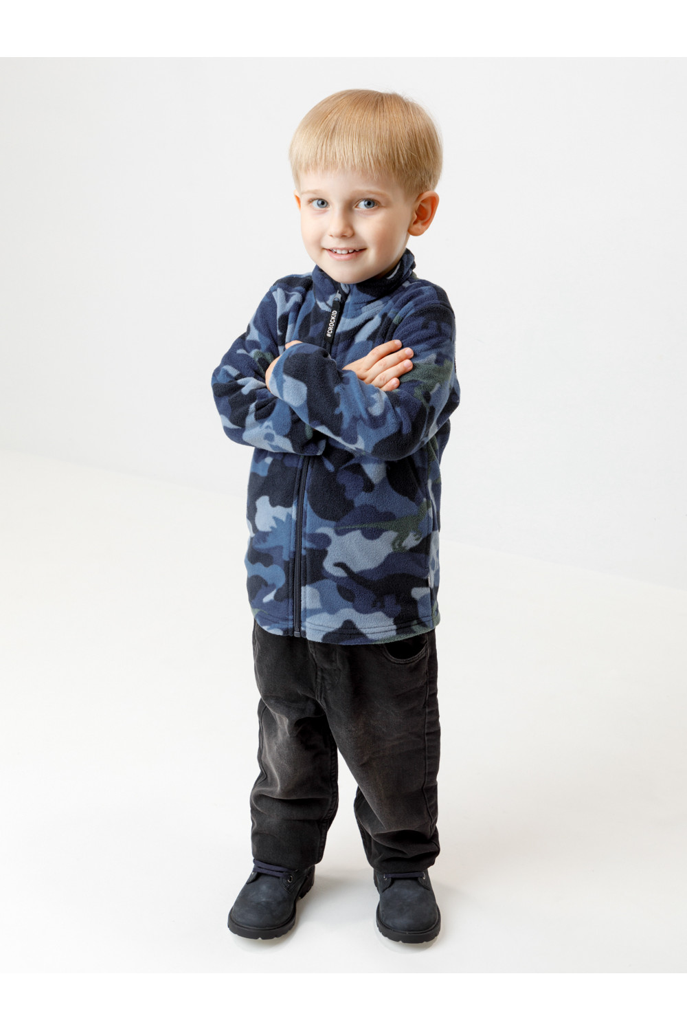 Флисовая куртка для мальчика. У изделия высокий воротник и застёжка на молнию с мягкой защитой шеи и подбородка. По бокам два кармана. Оригинальная набивка выполнена из стойких гипоаллергенных текстильных красителей. Куртка сохраняет цвет и форму после многократных стирок.