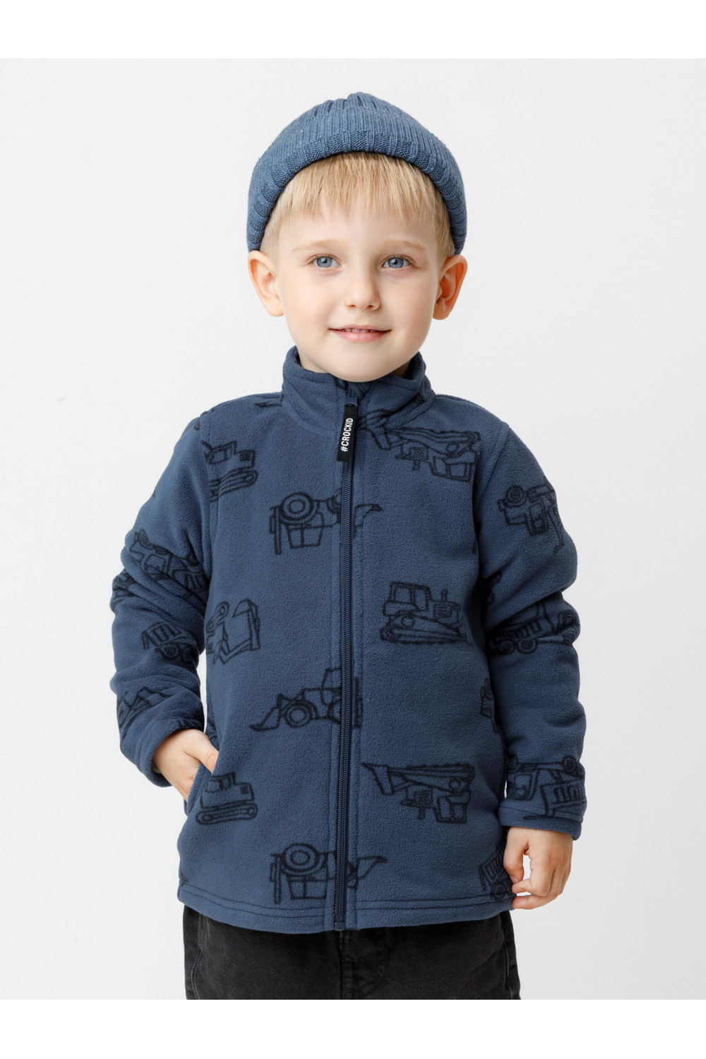 Флисовая куртка для мальчика. У изделия высокий воротник и застёжка на молнию с мягкой защитой шеи и подбородка. По бокам два кармана. Оригинальная набивка выполнена из стойких гипоаллергенных текстильных красителей. Куртка сохраняет цвет и форму после многократных стирок.