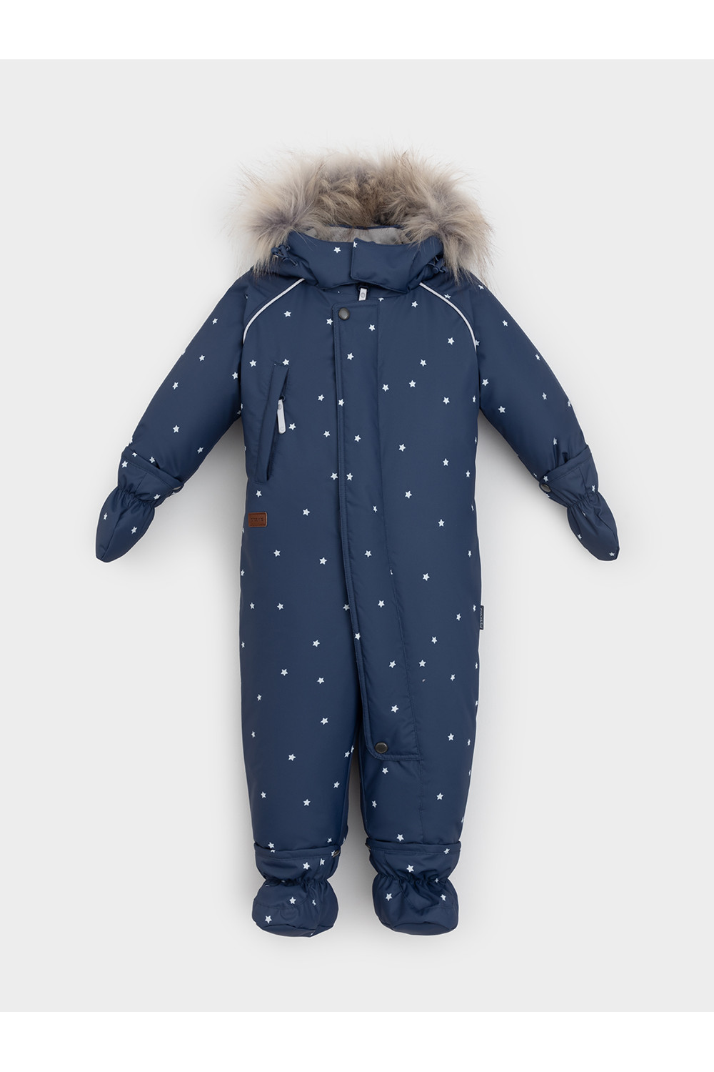 Зимний комбинезон ясельный с утеплителем SEE®: 300 г/м2. Выполнен из мембранной ткани с дополнительной тефлоновой обработкой, которая предохраняет изделие от загрязнений и отталкивает влагу. Подклад выполнен из 100% хлопка. Комбинезон застёгивается на молнию и внешнюю планку на липучках, предусмотрена защита подбородка. Несъёмный капюшон имеет эластичную утяжку со стопперами и отстёгивающийся мех на молнии. Резинка по спинке для лучшего прилегания. На груди карман на молнии. По рукавам и низу изделия эластичные манжеты, на ножках отстёгивающиеся силиконовые штрипки. В размерах 74-80 и 80-86 в комплекте идут рукавицы и пинетки. Во всех изделиях верхнего ассортимента для безопасности ребёнка предусмотрены светоотражающие элементы.
