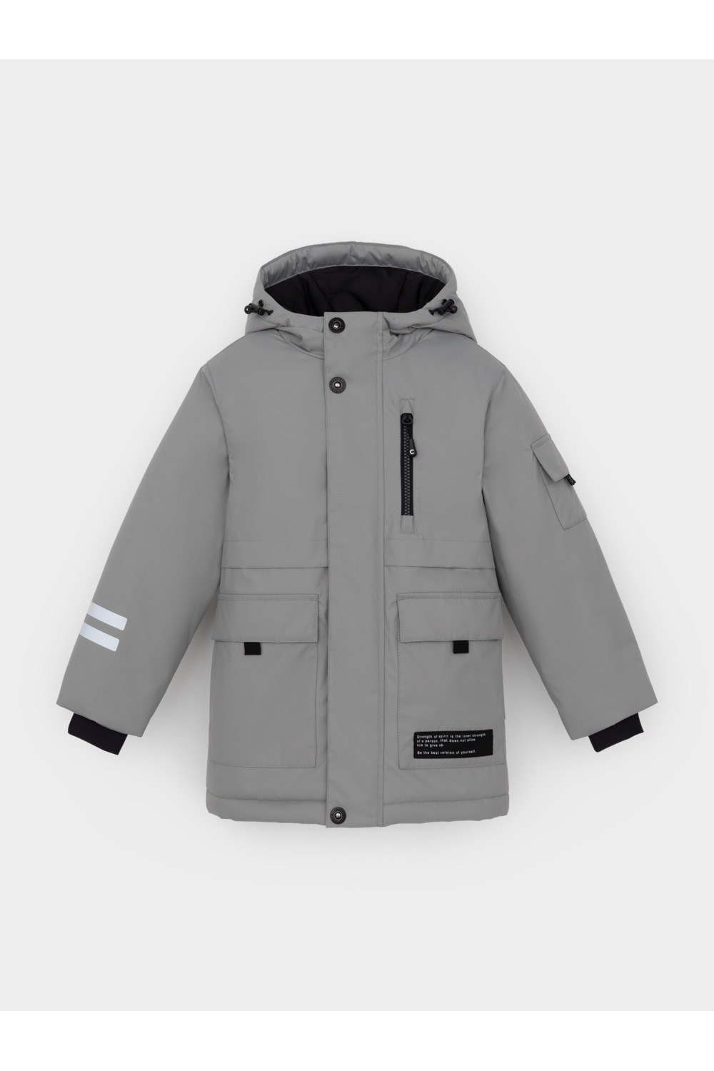 Зимняя куртка для мальчика с утеплителем SEE®: 250 г/м2. Выполнена из мембранной ткани с дополнительной тефлоновой обработкой, которая предохраняет изделие от загрязнений и отталкивает влагу. Подклад выполнен из 100% полиэстера Tricot. Куртка застёгивается на молнию и на дополнительную планку с кнопками. У изделия предусмотрена защита подбородка. Несъёмный капюшон имеет эластичную утяжку со стопперами, глубина капюшона регулируется при помощи липучки. На рукавах внутренние эластичные манжеты. Два накладных кармана с клапанами по бокам и один карман на груди. Во всех изделиях верхнего ассортимента для безопасности ребёнка предусмотрены светоотражающие элементы.