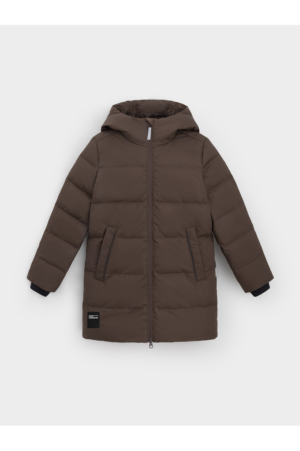 Зимнее пальто для мальчика с натуральным утеплителем из гусиного пуха (70%) и пера (30%). Выполнено из мембранной ткани с дополнительной тефлоновой обработкой, которая предохраняет изделие от загрязнений и отталкивает влагу. Подклад выполнен из 100% полиэстера. Пальто застёгивается на молнию, предусмотрена защита подбородка. Несъёмный капюшон имеет эластичные утяжки. По бокам два кармана на молнии, так же имеется внутренний карман. В рукавах мягкие внутренние манжеты. Во всех изделиях верхнего ассортимента для безопасности ребёнка предусмотрены светоотражающие элементы.