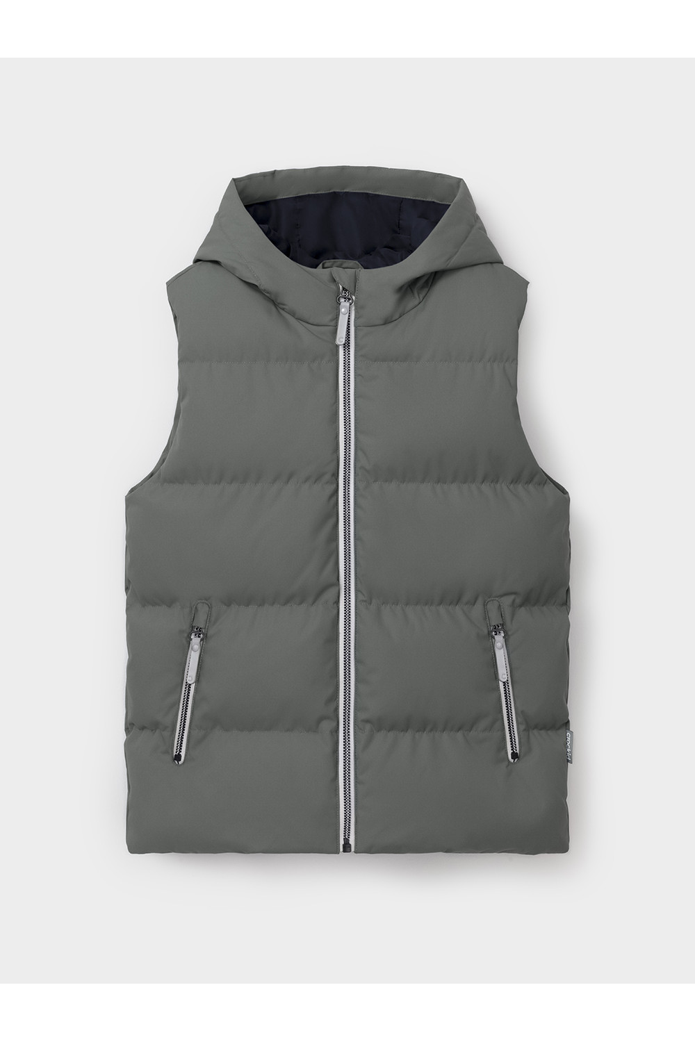 Стёганый жилет с капюшоном для мальчика с утеплителем, 120 г/м2. Выполнен из мембранной ткани с дополнительной тефлоновой обработкой. Данный вид обработки предохраняет изделие от загрязнения и лучше отводит влагу. Подклад из 100% полиэстра. Капюшон не снимается. Изделие застёгивается на молнию, предусмотрена защита подбородка. Два кармана по бокам застёгиваются на молнии. Во всех изделиях верхнего ассортимента для безопасности ребёнка предусмотрены светоотражающие элементы.