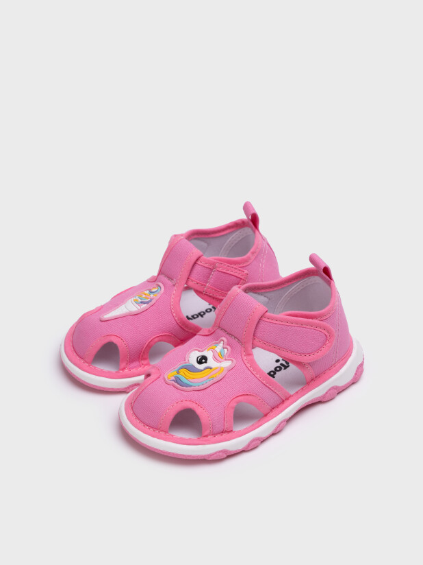 Сандалии детские для девочки. При ходьбе сандалии издают писк - для ребенка это интересный игровой элемент, а мамы будут всегда слышать своего ребенка на детской площадке. При желании пищалку можно вынуть. Сандалии с закрытой пяткой и удобным ремнем с липучкой, который позволяет ребенку обуваться самостоятельно. Модель выполнена из экологичного и гипоаллергенного хлопкового материала, который идеально подходит для маленьких детей. Разные патчи (мороженое и единорог) на правой и левой полупаре позволяют ребенку в игровой форме научиться определять правую и левую ножку. Двухсоставная подошва из ТПР очень гибкая, легкая и нескользкая. Особая технология сборки обуви добавляет ей дополнительный комфорт.