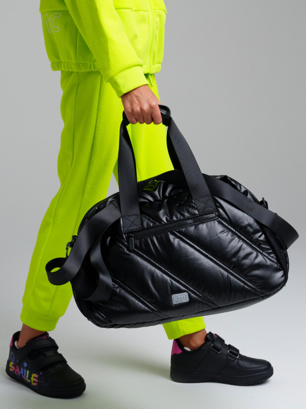 Сумка спортивная текстильная 37*32*14 см. Ручки с креплением, плечевой регулируемый ремень. Боковой сетчатый карман, карман на молнии, карман на кнопке, внутреннее отделение из сетки. Светоотражающий патч.